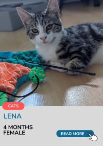 😽Lena is your Loving Lap Cat. This girl has boundless energy and love to share – Play and Cuddle are her only two settings. She loves both human and cat company. Lena is gentle and sweet and purrs like a motor.