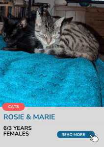 You’ll rarely see this dynamic duo apart – whether they’re chasing one another, eating together, or settling down for a nice snooze. Marie is a sweetheart who loves soaking up your affection and attention! Belly rubs are her favourite. She’ll spend the day sleeping by the sunny window, but her playful side comes out at night! Rosie likes a bit more personal space, but she’ll still be your loyal companion, always curious about what you’re up to. Treats are the way to her heart!